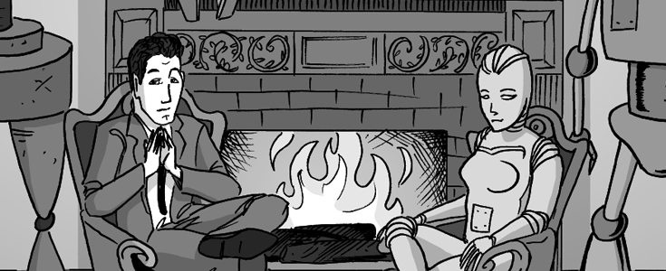 During the evening, as the Japanese were entertaining the robots, one Japanese male official got drunk and started to flirt with the “female” robot, A.R.L.E.N.E.  In the “family photo” Asimovia sent out several weeks back, A.R.L.E.N.E. can be seen sitting in a chair opposite of Priceworth.  She was built in 1932 by the French roboticist, Pierre Gavreau, to resemble his deceased wife, Penelope.  Obviously, A.R.L.E.N.E. couldn’t fill the hole in Gavreau’s heart, and he banished her from his home.  A.R.L.E.N.E. has wandered the globe since then, and for about 20 years, she was turned off and stored in a millionaire’s vault as a trophy.  No one knows how she got free or how she met Priceworth, but it is surely a deep, affecting story that would certainly make a great movie someday.
